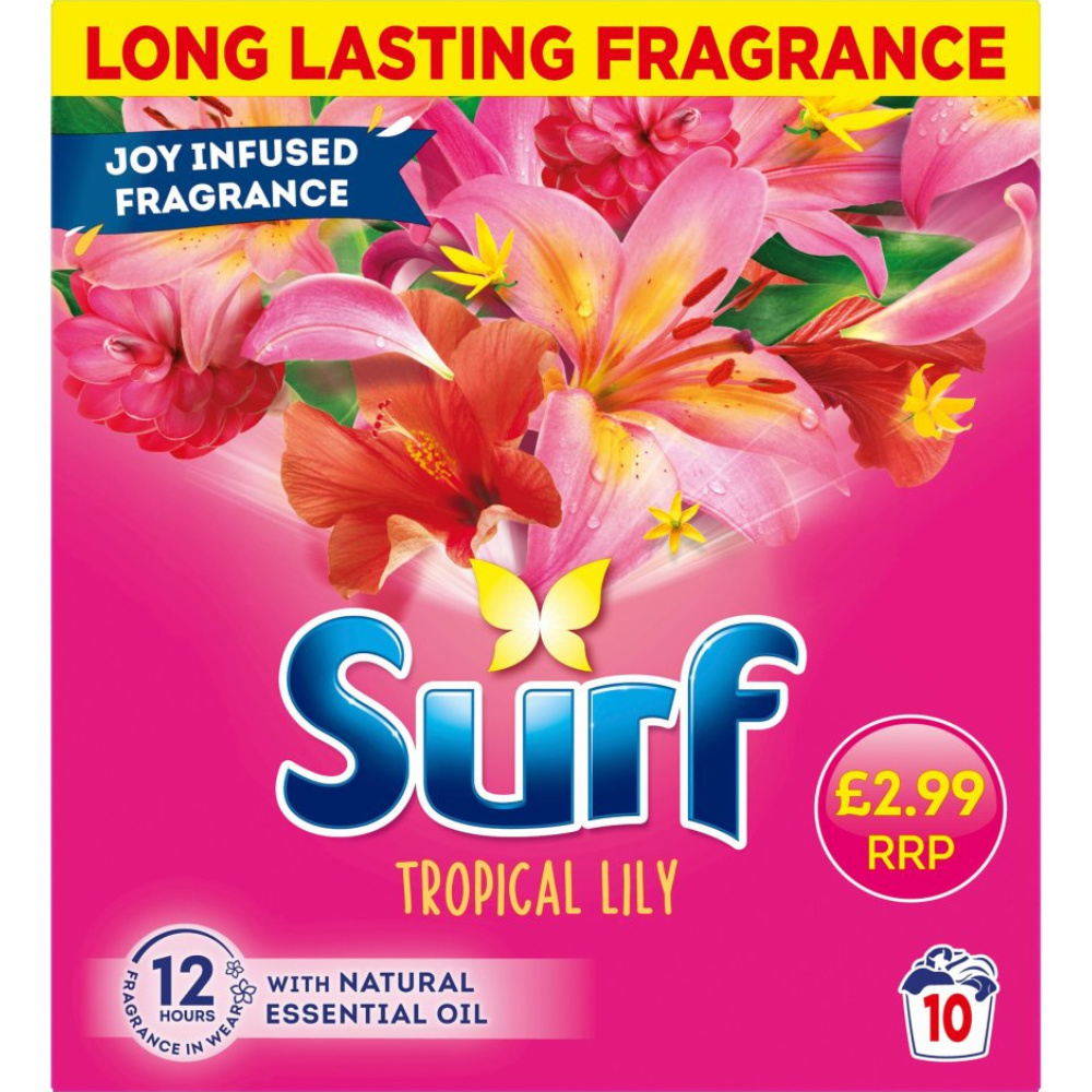 Surf Washing Powder Tropical Lily 500g – deep cleaning power with a long-lasting floral fragrance. 10 washes per pack. Available for fast delivery in Dundee.